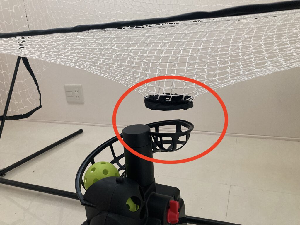 ネットの底に穴があり、ボールを正面に打ち返すと自然にその穴に流れてマシンに戻る仕組み。